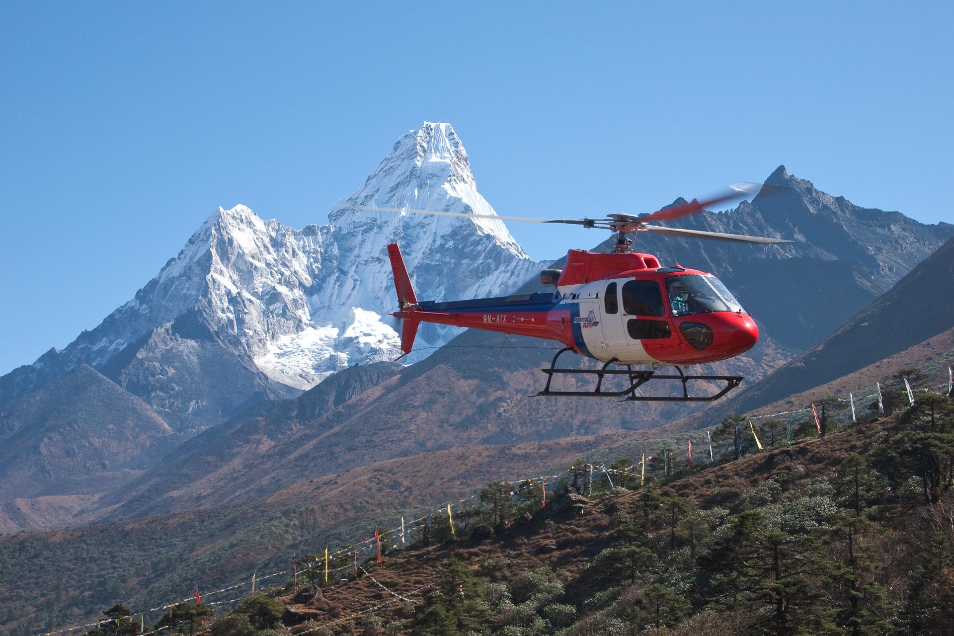 Fly alongside the Dudh-Kosi River, passing villages and landmarks like Namche Bazaar and Tengboche Monastery. Enjoy views of Mt. Everest, Ama Dablam, and other iconic peaks. If needed, the group may split at Pheriche to ensure safe weight distribution.